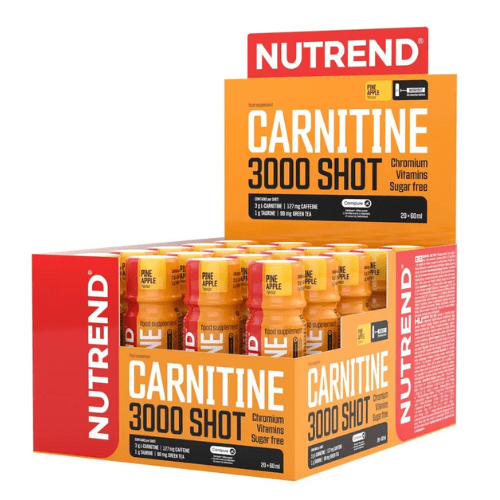 Nutrend Carnitine 3000 Shot – добавка на основе L-карнитина, дополнительна обогащена витаминами группы В, а также хромом. В данной добавке L-карнитин находится в удобной для приема жидкой форме, которая легко усваивается, в дозировке 3000 мг на порцию. Ампульная дозировка 60 мл определяется оптимальным количеством потребления. Шот содержит сильную дозу 3 г L-карнитина, таурина, хрома, который способствует нормальному метаболизму макроэлементов, кофеин и экстракт зеленого чая, который также помогает контролировать вес. как витамины B1, B3, B5 и B6, которые способствуют снижению усталости и утомляемости и нормальному энергетическому обмену.